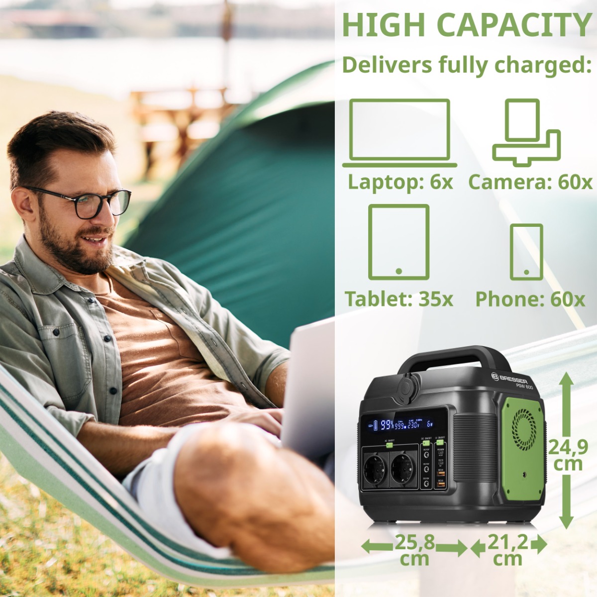 by BresserNever lose power on the go again with this 600 Watt mobile power bank from BRESSER. Whether you’re camping, working in the garden or experiencing a power cut at home, the numerous connection options will allow you to safely charge or power almost all common electrical devices.