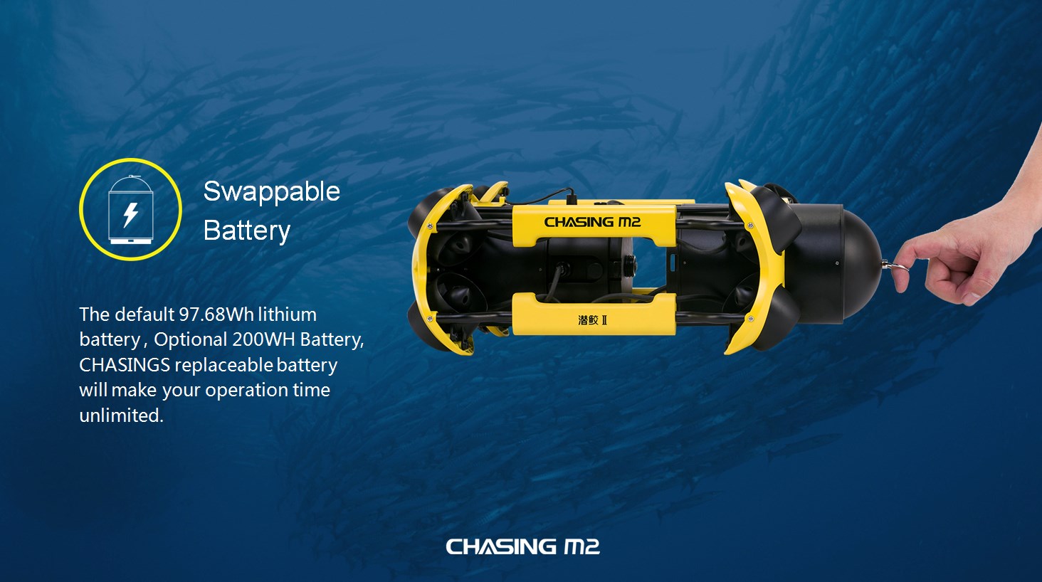 The advantage of the CHASING M2 is the ability to swap its batteries. This allows for perpetual discovery underwater without the need to recharge the drone. By squeezing two clips and pulling on the battery ring, the battery detaches with ease. Charging time for each battery is approximately 1 hour.