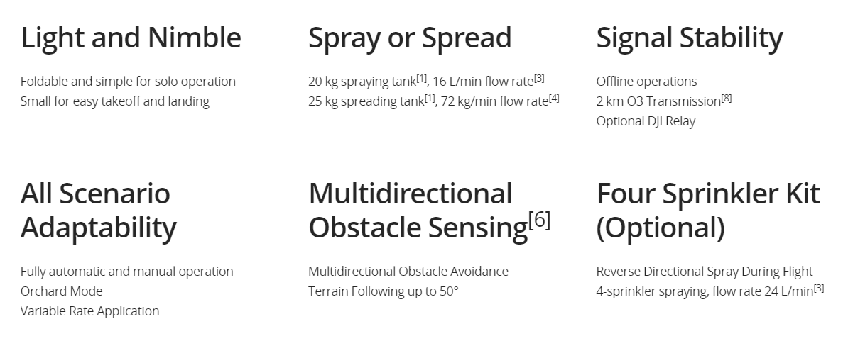 [1] Data was measured at sea level. The payload weight is greatly affected by the ambient temperature and altitude. The take-off payload weight needs to be reduced by 5 kg for every 1,000 m increase in altitude. The DJI Agras app will recommend the payload weight according to the current status and surroundings of the aircraft. When adding materials, the maximum weight should not exceed the recommended value, otherwise flight safety may be compromised.