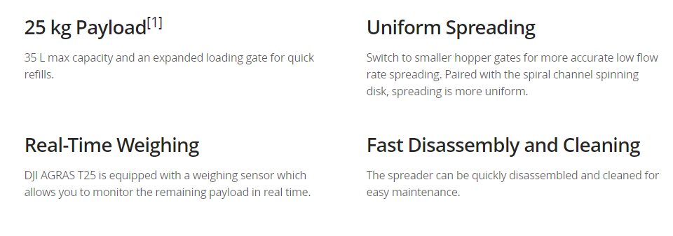DJI AGRAS T25's new spreader and spiral channel spinning disk significantly improve spreading efficiency and smoothness.