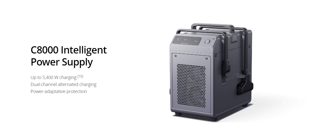 The D6000i Multifunctional Inverter Generator delivers efficient inversion and rectification, maximizing fuel economy. The DB800 Intelligent Flight Battery supports ultra-fast charging[7] in 9 minutes. The C8000 Intelligent Charger can charge batteries directly with utility power.
