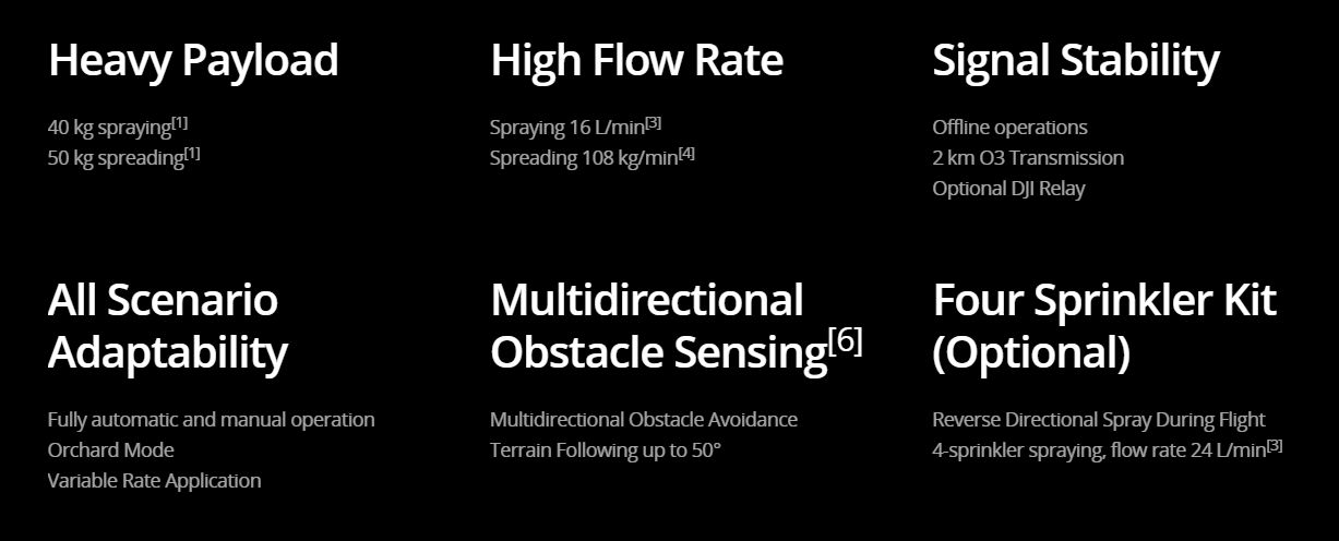 [1] Data was measured at sea level. The payload weight is greatly affected by the ambient temperature and altitude. The take-off payload weight needs to be reduced by 10 kg for every 1,000 m increase in altitude. The DJI Agras app will recommend the payload weight according to the current status and surroundings of the aircraft. When adding materials, the maximum weight should not exceed the recommended value, otherwise flight safety may be compromised.