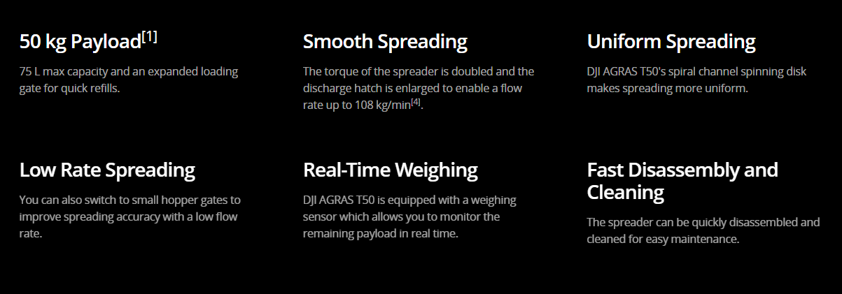 DJI AGRAS T50's new spreader and spiral channel spinning disk significantly improve spreading efficiency and smoothness.