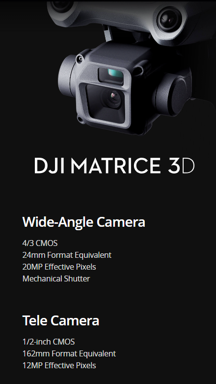 DJI Matrice 3D is specifically designed for DJI Dock 2. Matrice 3D is equipped with both a tele camera and a wide-angle camera with a mechanical shutter, meeting the needs for 1:500 high-precision mapping tasks.