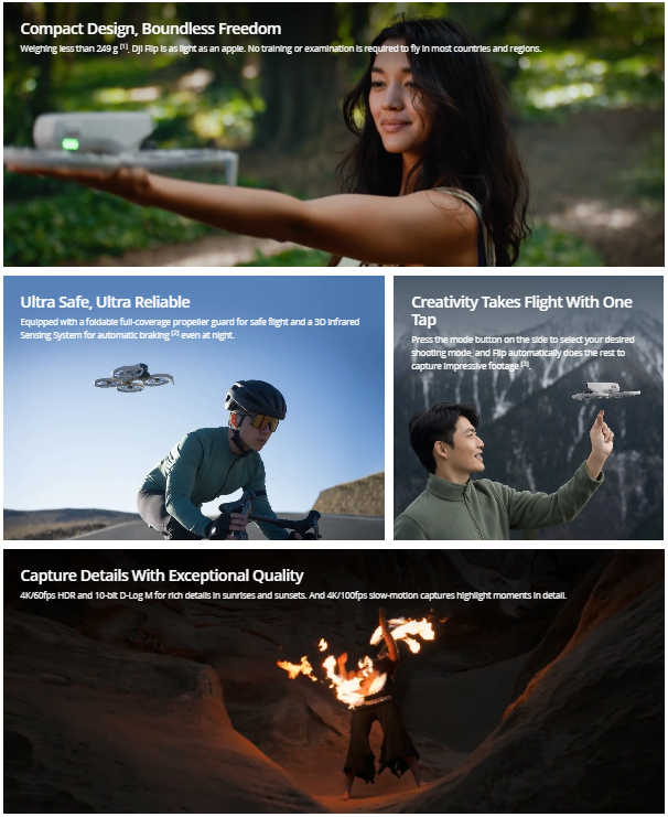 by DJIDJI Flip features a stunning compact design with exceptional imaging capabilities. It supports palm takeoff [1] without a remote controller, allowing you to capture moments on the go easier than ever before.