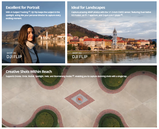 Whether you're just starting with photography or are a seasoned pro, you can quickly capture stunning images and easily produce professional-grade work through DJI Flip's series of intelligent shooting features.