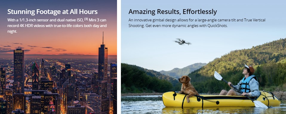 Record in dazzling 4K HDR with true-to-life colors both day and night. Mini 3's camera is equipped with a 1/1.3-inch CMOS sensor with dual native ISO and chip-level HDR technology.