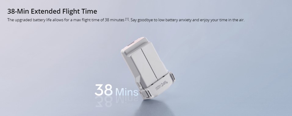 2. Measured at a constant speed of 21.6 kph in windless conditions. With the Intelligent Flight Battery, the aircraft can fly for up to 38 mins. With the Intelligent Flight Battery Plus (sold separately and only in select countries), the flight time is extended to up to 51 mins, but the aircraft will weigh more than 249 g. Always check and strictly abide by local laws and regulations before flying.