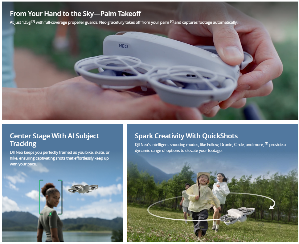 At 135 g,[1] DJI Neo is DJI's lightest and most compact drone to date. [2] Takeoff and land on your palm effortlessly without a remote controller, and capture cinematic footage with YOU in focus. Soar through breathtaking scenery, indoors and out, and be sure to include everybody in a group photo. Enjoy a fresh perspective on everyday life with DJI Neo.