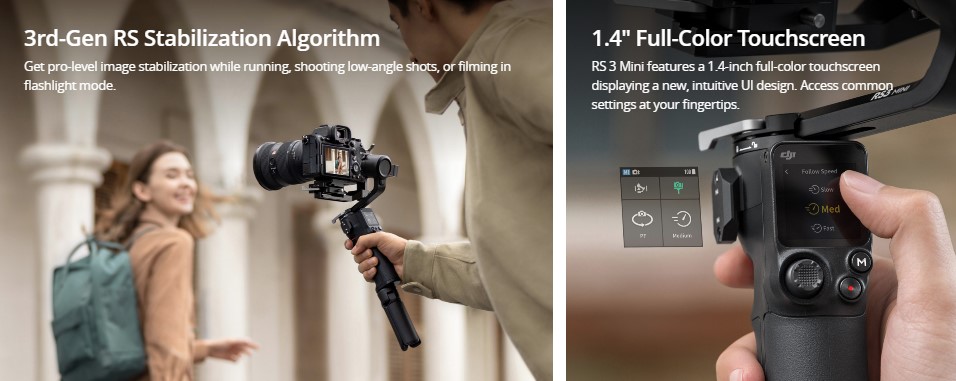 Custom-designed for mirrorless cameras, the DJI RS 3 Mini is a lightweight gimble stabilizer that supports a payload of up to 4.4 lb. This single-grip gimbal uses the 3rd Gen. DJI RS stabilization algorithm for enhanced performance. Weighing just 1.9 lb, the RS 3 Mini is perfect for on-the-go video capture.