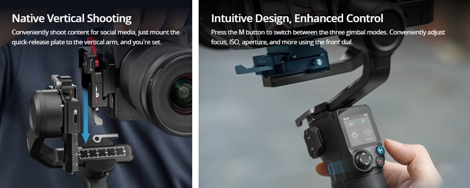 The RS 3 Mini can switch between horizontal mode and a vertical view for social media without the need for additional accessories.
