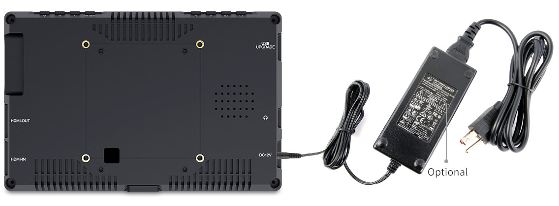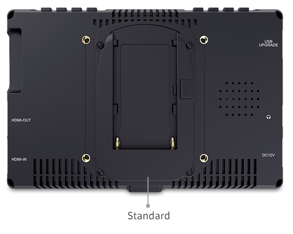 For power, there's a 12V DC input and a F970 battery plate (standard). You could connect the 12V DC input you get continuous power or you can run it off of Sony compatible F970 rechargeable batteries. You can also choose D28S/D54, LP-E6 or U60 battery plate to install other different types of batteries for power supply.