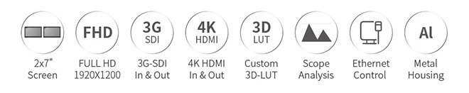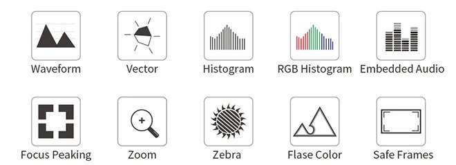 The monitor includes a plethora of useful features such as histogram, false color, focus assist, embedded audio, pixel to pixel, frame guides, nine grid etc. As well as a flexible 3D LUT implementation (use built-in LOG to Rec.709 video or upload .cube files). And both screens can be set independently!