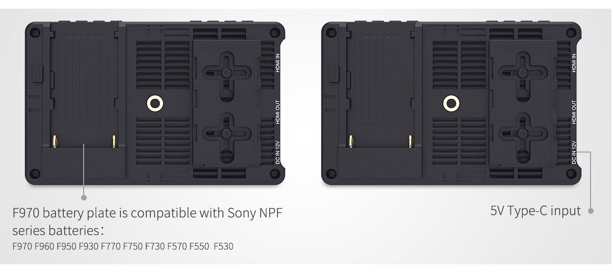 In addition to the power supply through the F970 battery plate and 12V DC power input (can be using 12V/1.5A adapter), it also supports 5V Type-C input, which can be powered by mobile phone charger or power bank. (At least 5V/2A)
