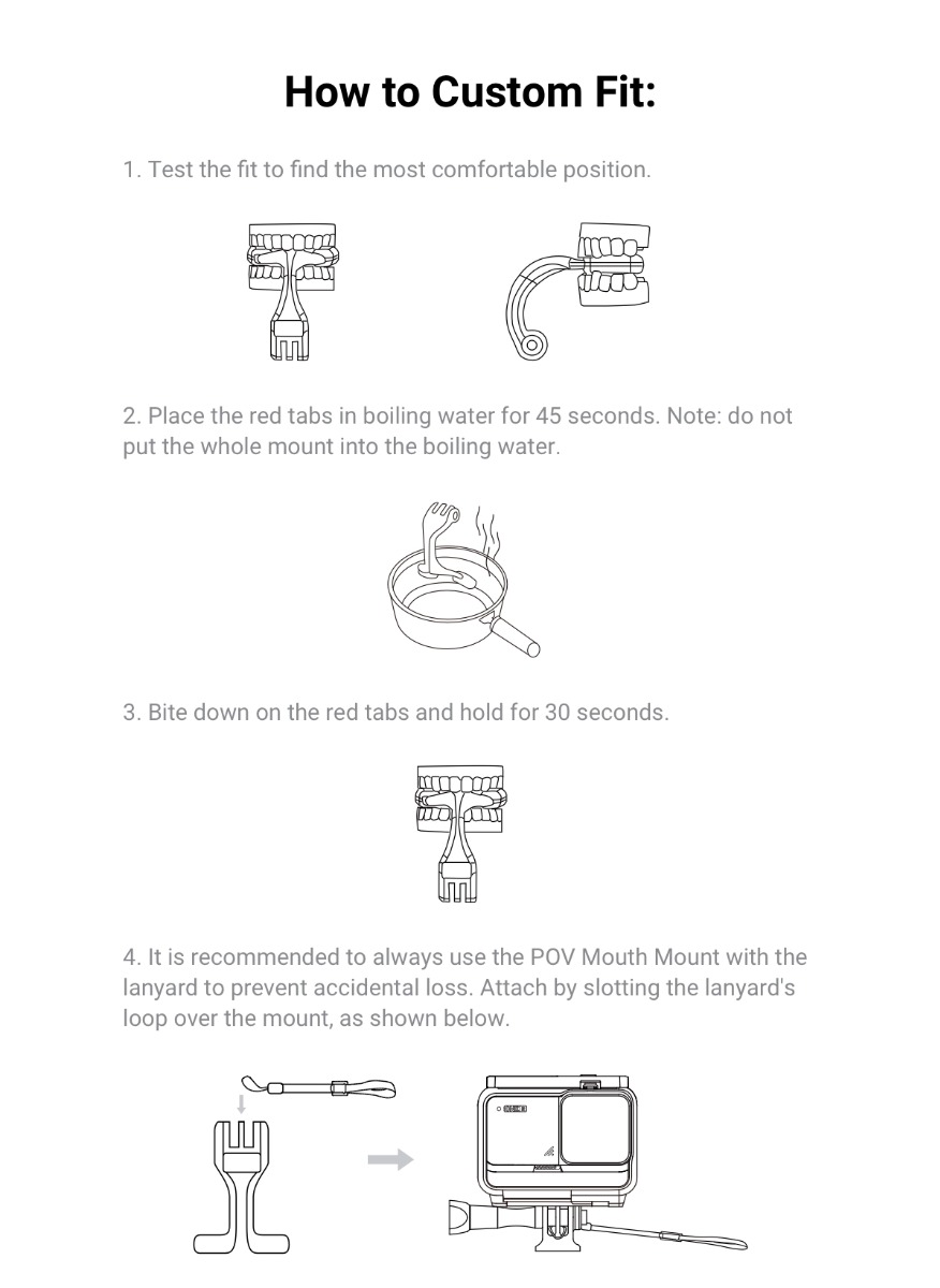- A multi-purpose accessory that can be used as a mouth mount, tripod, hand grip, hook mount and more.