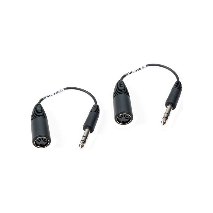 The Neumann MIDI Adapter Set includes two cables for connecting the 1/4" MIDI input and output on the MT 48 audio interface to various MIDI devices. The cables are terminated with a 5-pin DIN male connector on one end and a 1/4" male connector on the other.