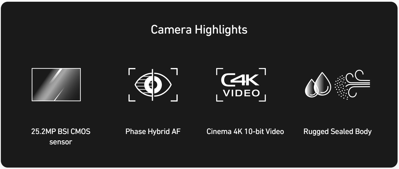 - 25.5M sensor and 13+ stop dynamic range boost for vibrant, detailed photo/video