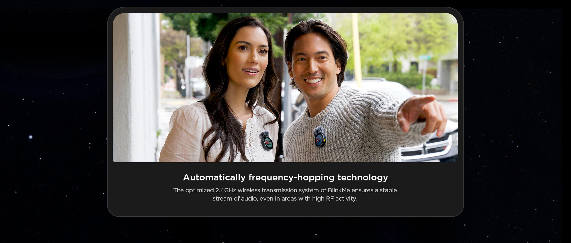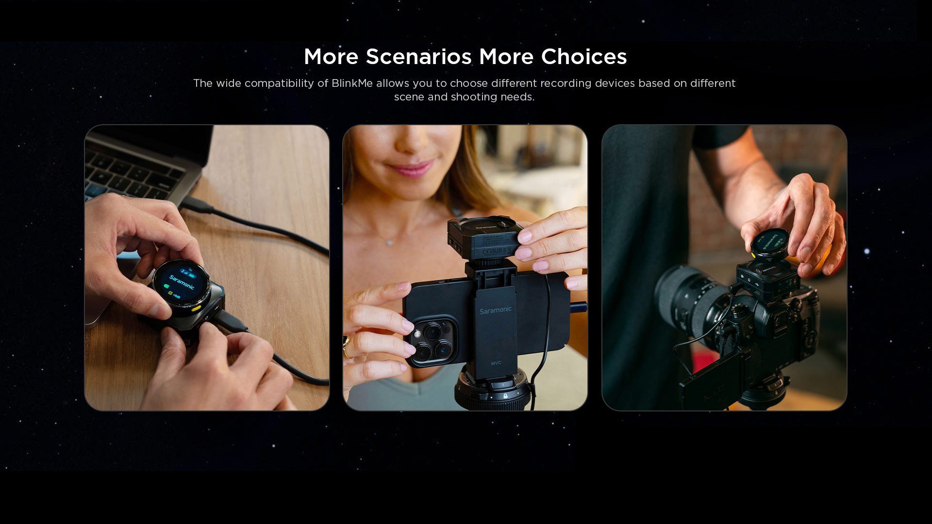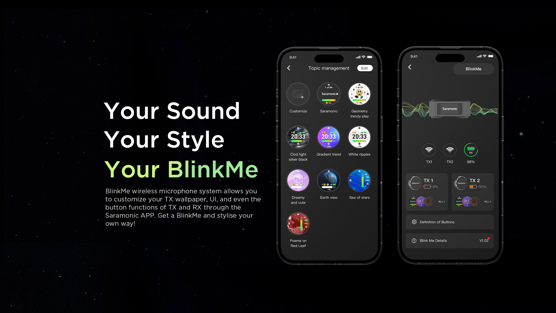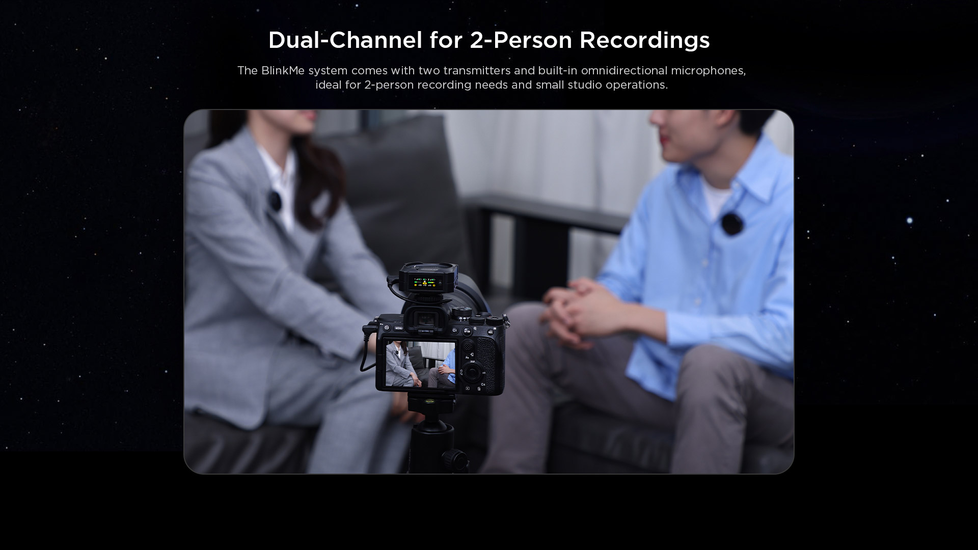 The cutting-edge BlinkMe not only delivers unparalleled sound, but also serves as a platform for expressing creators' unique personality. Boasting a sleek touchscreen interface, customizable features, on-board recording, safety track, magnetic attachment, and a patented charging dock design, BlinkMe wireless microphone is an exceptional choice for both seasoned professionals and creative enthusiasts.