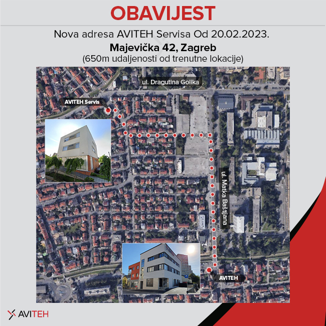 AVITEH Servis od 20. veljače 2023. godine seli na novu adresu: Majevička 42, Zagreb. Od tog datuma predaja robe na servis će se obavljati isključivo na novoj lokaciji te više neće biti moguće predati robu na servis na adresi naše poslovnice u Baštijanovoj! Prilikom odabira poslovnog prostora vođeni smo idejom da Servis ostane što bliže našoj prodajnoj poslovnici u Baštijanovoj pa je tako nova lokacija AVITEH Servisa udaljena samo 650m kako bi svim kupcima koji dolaze na servis prodajna poslovnica bila što pristupačnija. Zahvaljujemo se na razumijevanju, a niže možete vidjeti kartu i standardne upute o predaji robe na servis.