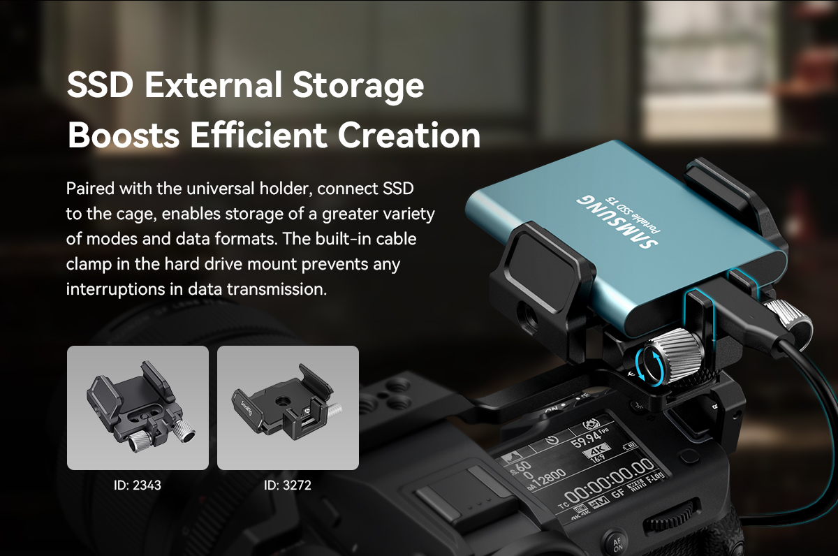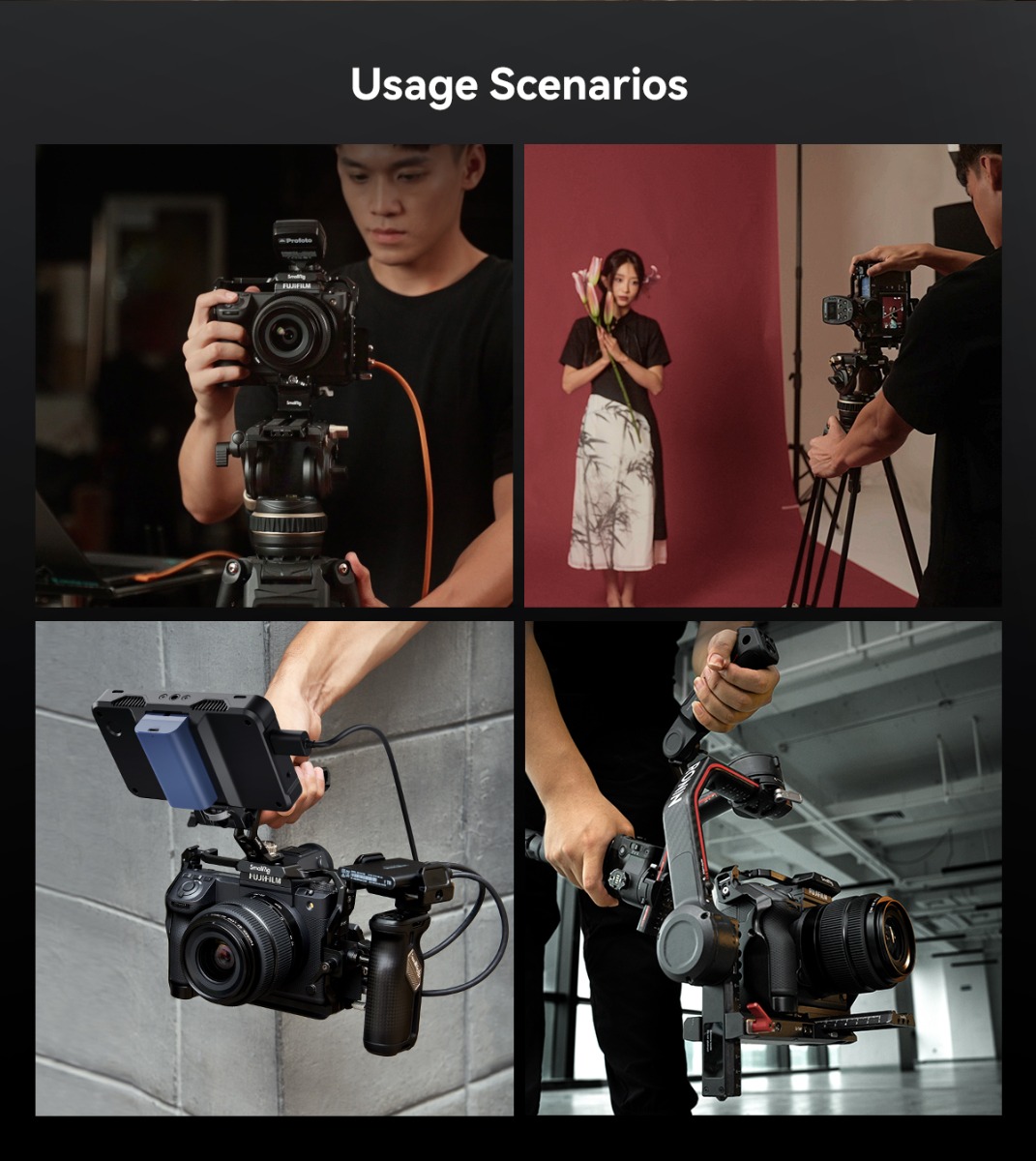 SmallRig Cage Kit for FUJIFILM GFX100 II 4201 is designed to protect the camera and attach accessories. The kit includes a cage and a HDMI & USB-C cable clamp. The cage, which locks FUJIFILM GFX100 II via one 1/4"-20 screw on the bottom and one side lock adapter on both sides, features rubber pads to prevent scratches. It leaves room for EVF, FAN-001 cooling fan and gives full access to buttons, card slots, flip screen and battery door. Among its mounting points, 1/4"-20 threaded hole, ARRI 3/8"-16 locating hole, NATO rail, cold shoe and 1/4"-20 locating hole support Side Handle 2093C / 4016 / 3847, Top Handle 3765, Monitor Mount 2903 / 2904, mini V Mount Battery Plate 2987, Single Rod Clamp 3598, Magic Arm 3873, Microphone 3468, LED Video Light 4055, etc. Also, there are strap holes for Hand Strap 3848 and Shoulder Strap 3485, QD mounts for Shoulder Strap 4118 and a bottom Arca Swiss quick-release plate for Arca-type tripods or DJI RS 2 / RSC 2 / RS 3 / RS 3 Pro gimbals for quick switch between gimbal, handheld and tripod modes. And the HDMI & USB-C cable clamp, secured via a thumb screw, helps ensure stable signal transmission.