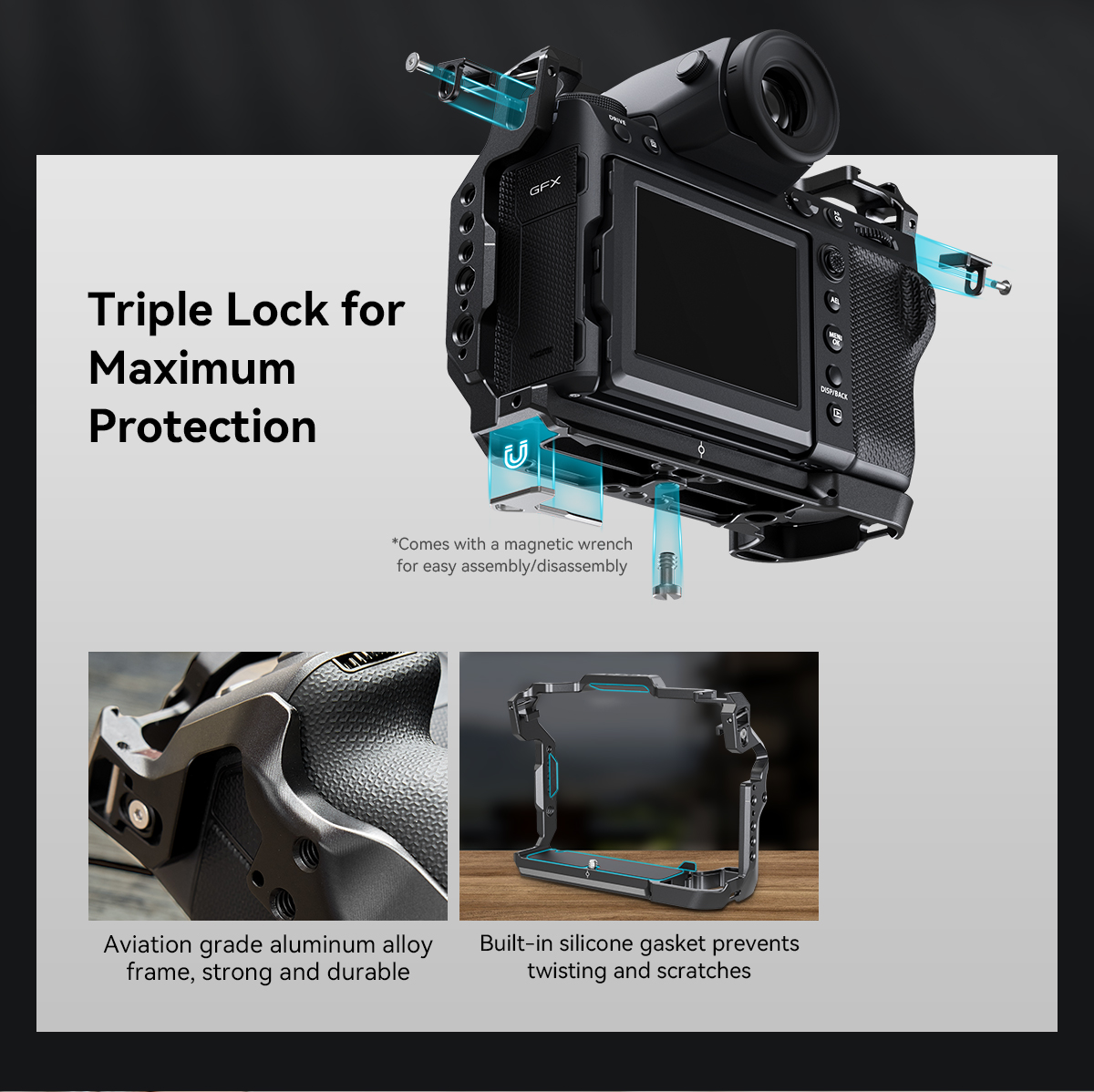 by SmallRigSmallRig Cage Kit for FUJIFILM GFX100 II 4201 is designed to protect the camera and attach accessories. The kit includes a cage and a HDMI & USB-C cable clamp.