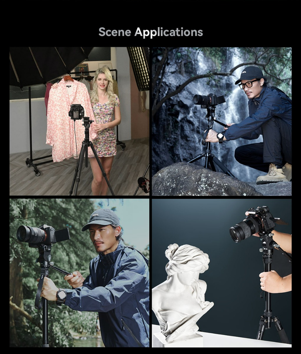 SmallRig CT195 Video Tripod Kit 4307 is delicately designed for videoing, live streaming, vlogging, etc., particularly in outdoor scenarios. It features reverse-folding Aluminum alloy legs to be folded down to 46cm and a center column to increase stability. The 4-section legs with knob locks allow you to adjust the working height to up to 185cm in seconds, and the detachable center column can be reversed for low-angle shots. By disassembling one of the legs and attaching it to the head, you can turn the tripod into a monopod. There is a 3-stop (23° / 55° / 79°) knob for quick angle adjustment to meet your needs. As for Video Head 4104 on the top, it enables a quick switch between horizontal and vertical shooting and the mounting direction of the quick release plate, supporting cage, and L-bracket. It also comes with a removable telescopic handle, which is easy to store and allows the head to swivel 360°and tilt +90°/-90° steadily. Besides, this tripod can support accessories like a magic arm via the a 1/4"-20 threaded hole. It weighs only 2.0kg and bears as much as 5kg, making it a good companion for shooting outdoors.