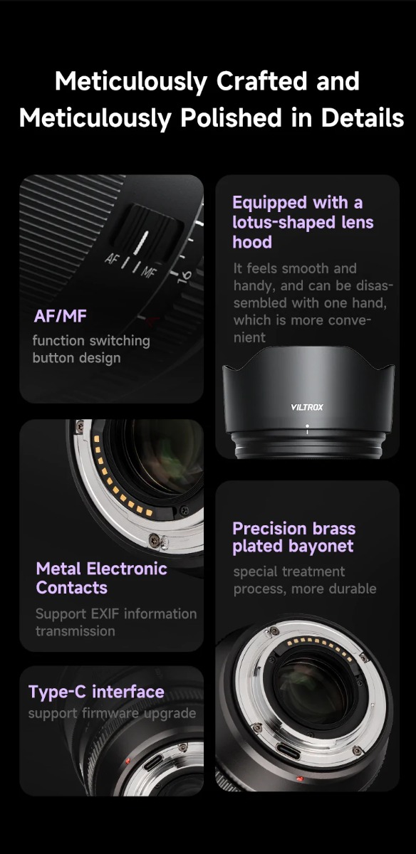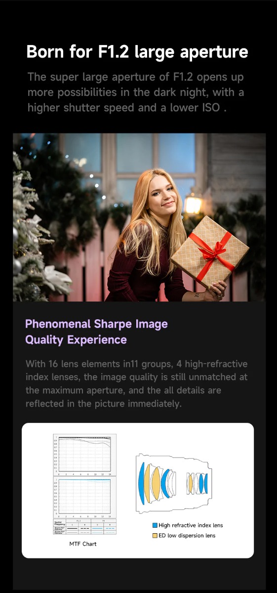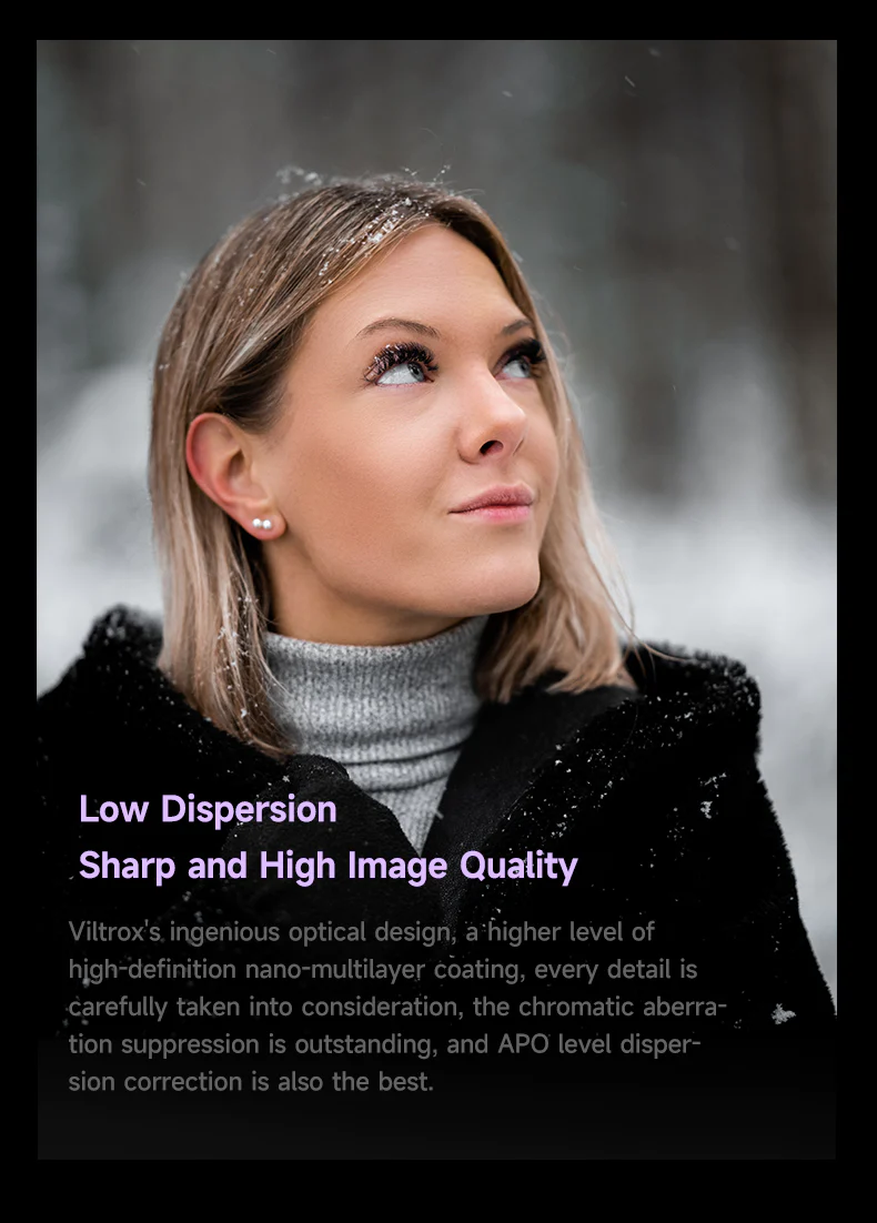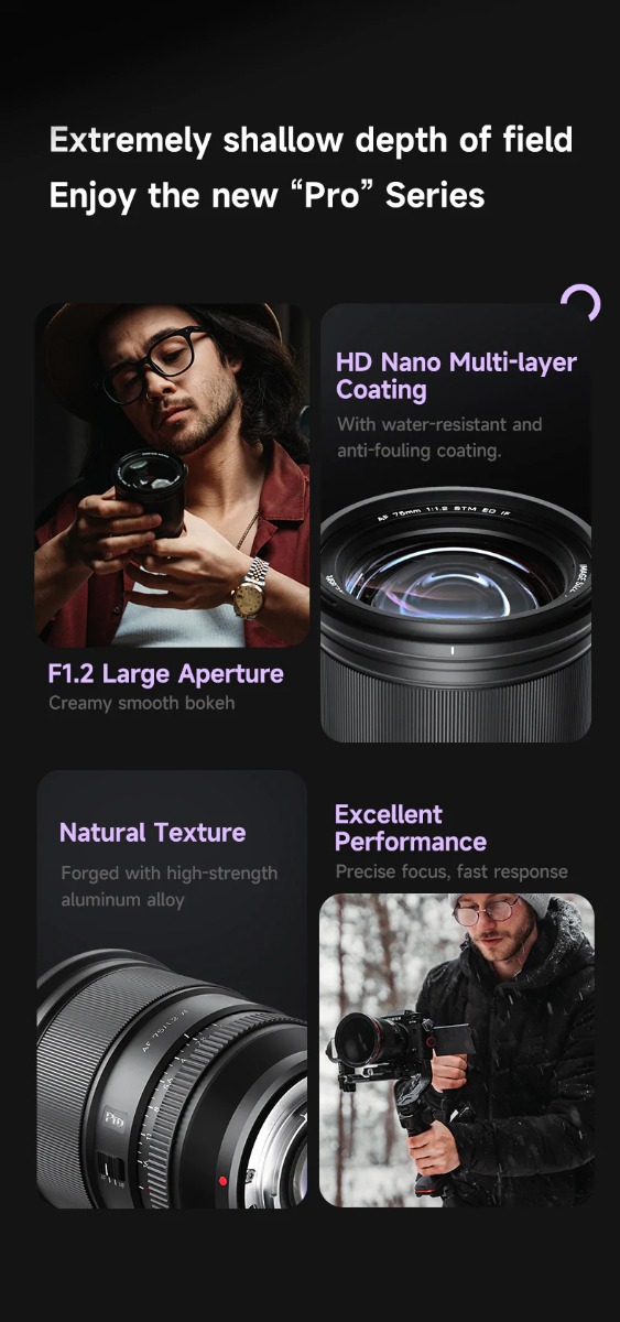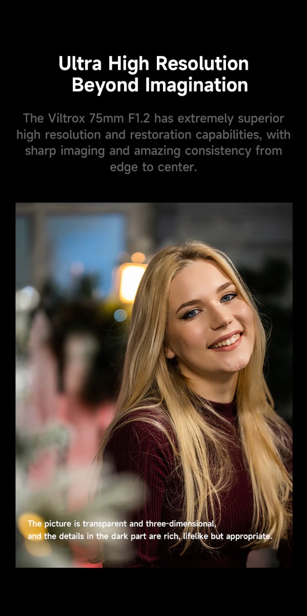 As the first high-end PRO series lens of VILTROX, the AF 75mm F1.2 XF Pro embodies VILTROX’s years of deep cultivation of optical technology accumulation. It adopts HOYA special nitrate material which is imported from Japan. With F1.2 super large aperture, it also features advanced autofocus performance as well as professional handling and reliability. The image quality has been improved in an all-round way, forging phenomenal clear picture quality and the ultimate beautiful virtual experience.