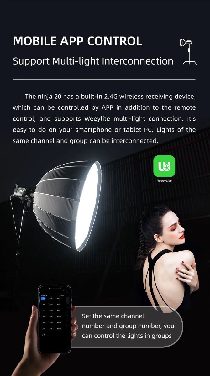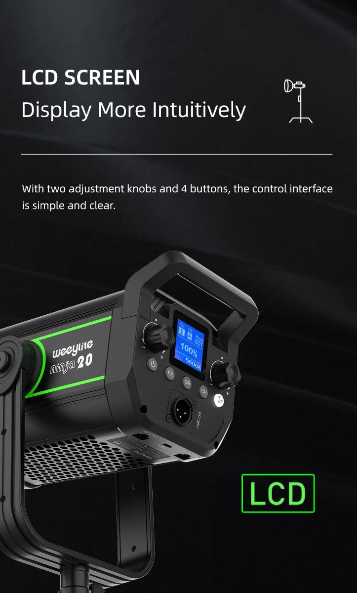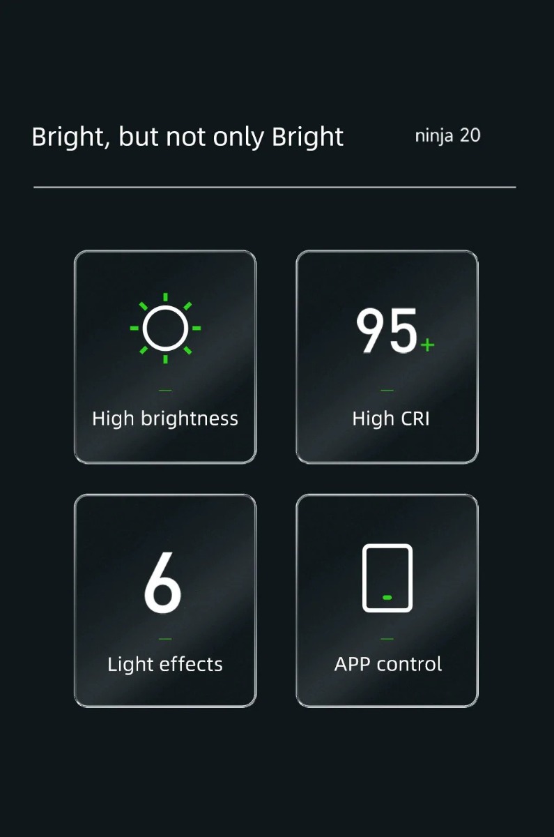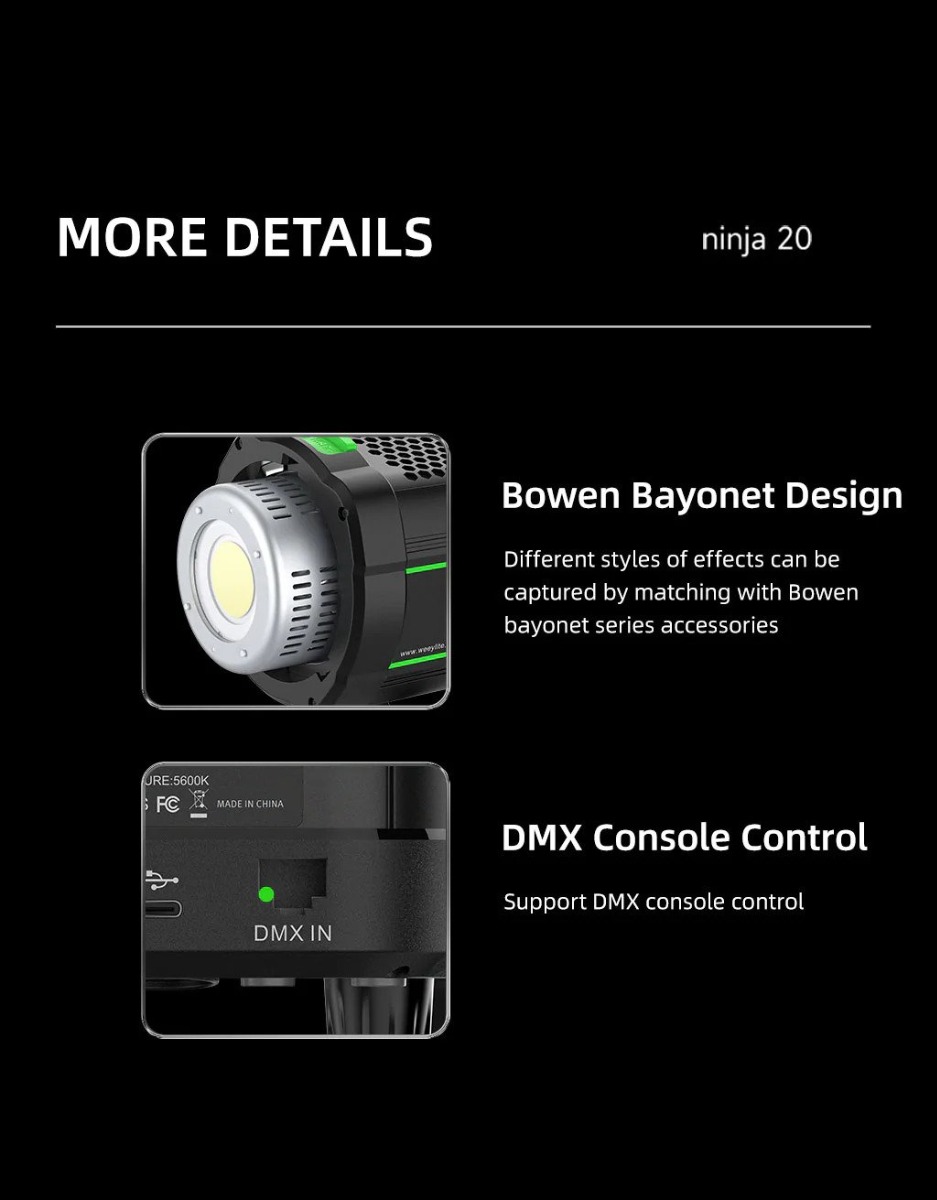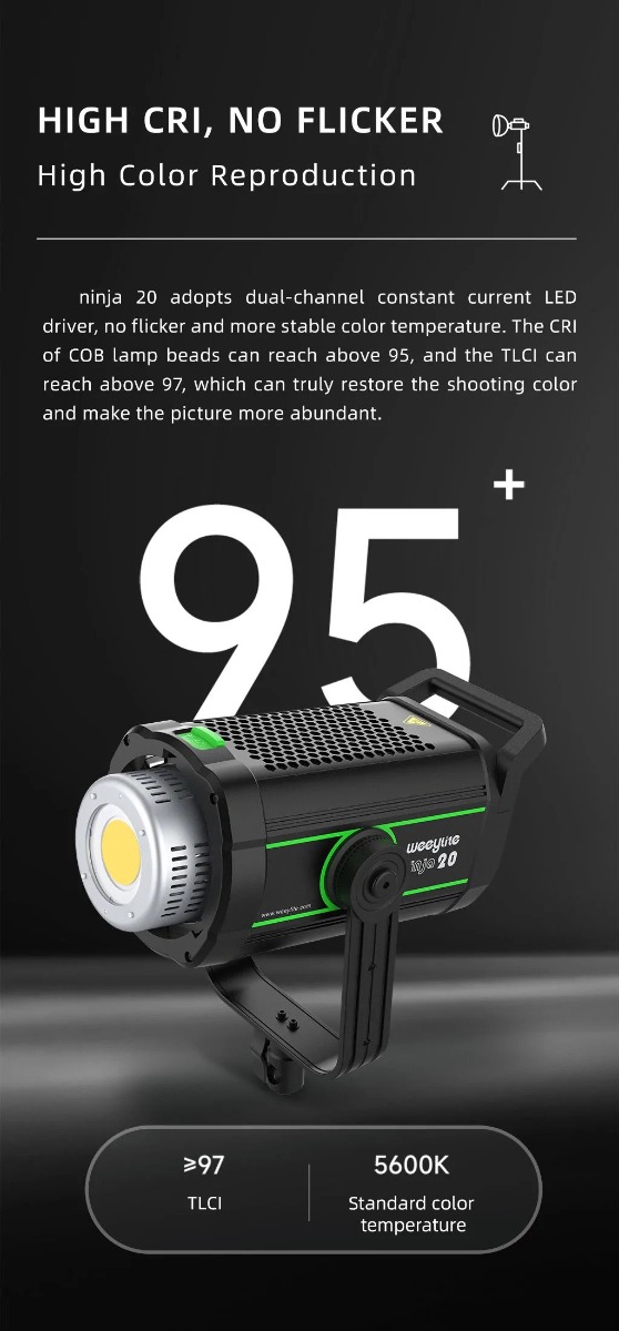 Ninja 20 adapts high color rendering index COB LED lamp beads,with high luminous efficiency,accurate color temperature and long life,It used for Photography, video, studio, exhibition hall and make-up and other high light requirements of the scenes.